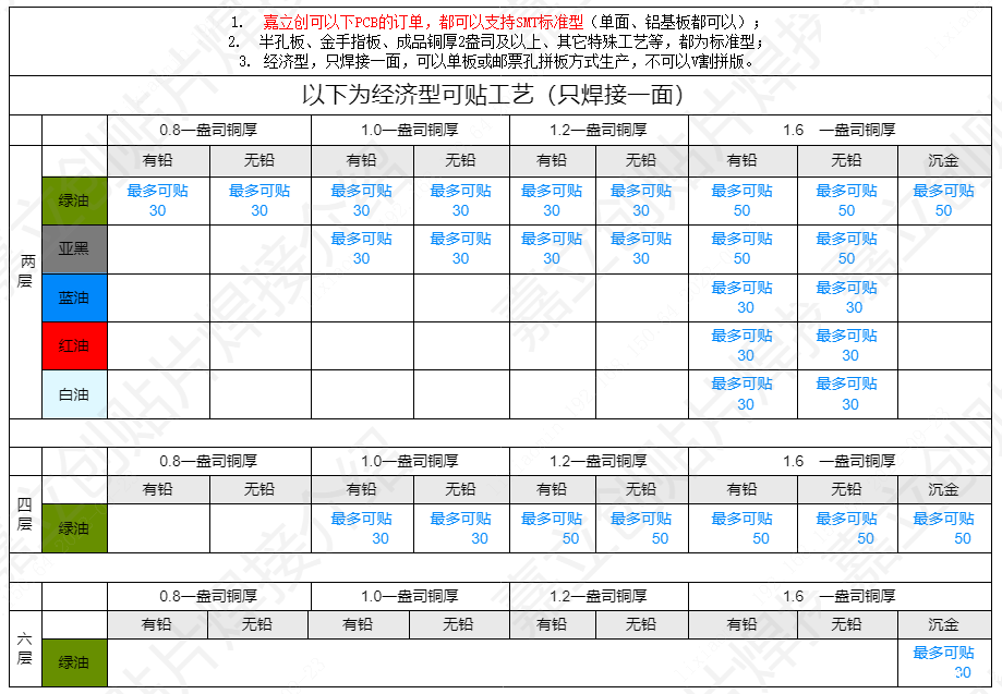 例如, PCB订单做10张大板,做紫色油墨,采用V割拼板出货。SMT需双面贴。 此单符合上面三点收费方式,SMT按最高一项双面贴,加收400元费用。