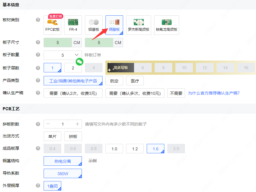 1.下单时,如何选择“单侧型”铜基板或者“夹芯型”铜基板。