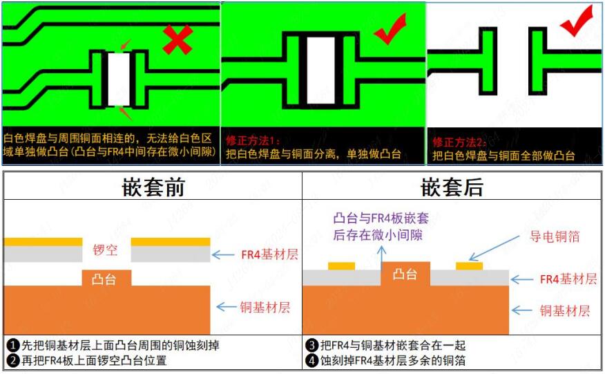 ① 所有凸台跟铜基相连在一起,设计大面积凸台应避免把导电的焊盘/线路等包围(因凸台位置在FR4板会锣空,若凸台中间有焊盘就会锣脱落)