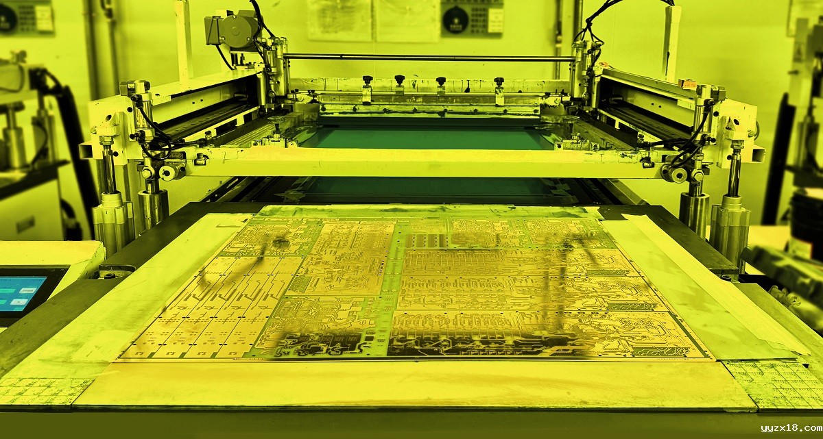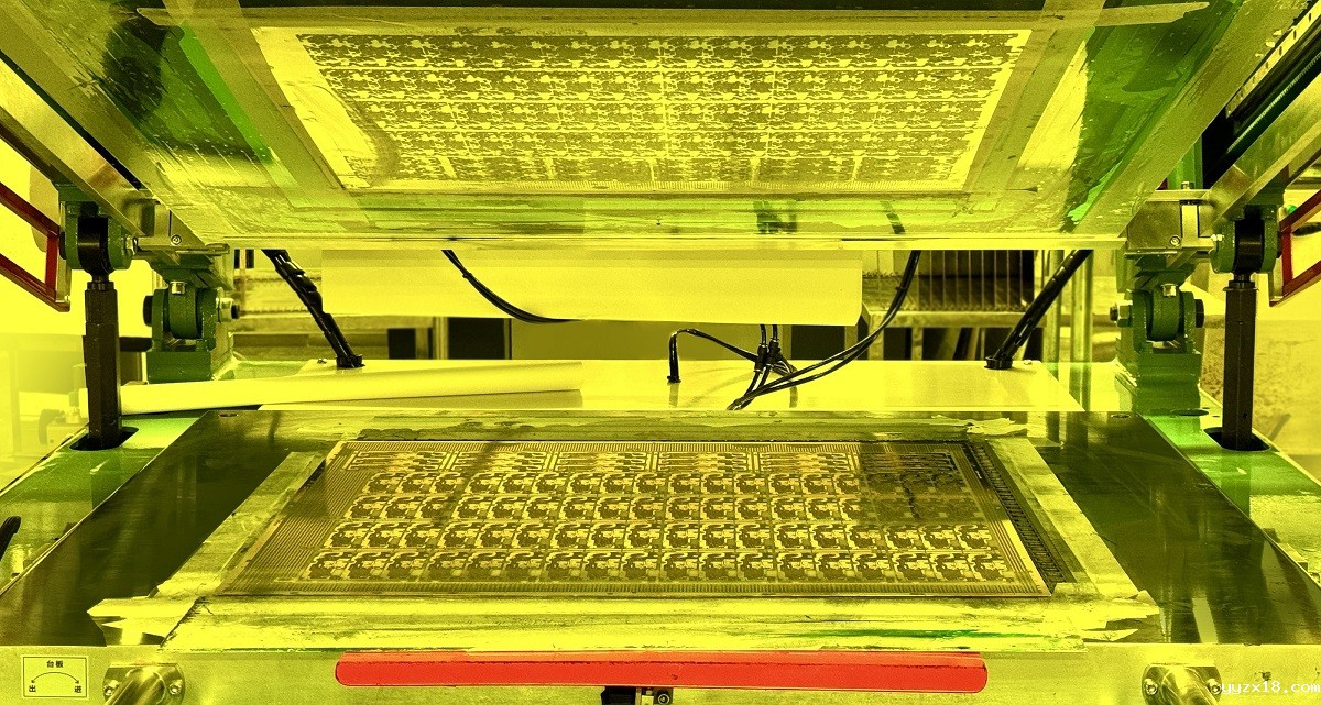 将电路板放入阻焊丝印机,通过刮刀压力,将阻焊油墨透过网纱印到PCB上: