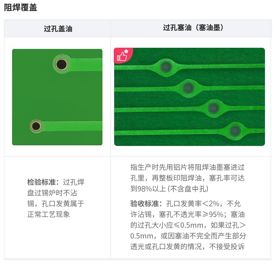 此外,区别还在检测标准:过孔盖油只要过孔焊盘过锡炉时不沾锡,孔口发黄属于正常工艺现象;而过孔塞油的验收标准包括了过孔焊盘孔口发黄率<2%,不允许沾锡,塞孔不透光率≥95%等,详情可见上方图片说明。