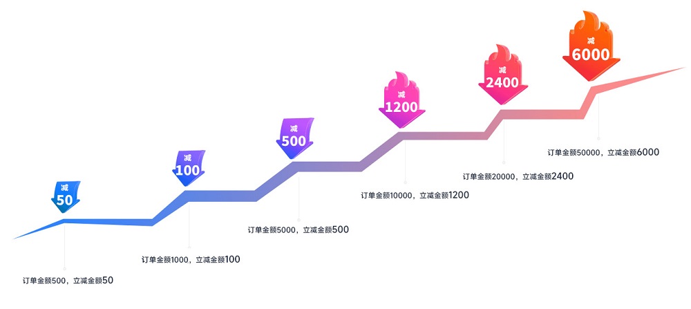 正式活动期间内,备料私有库现货器件,即可享受超级满减优惠。满500元减50,满1000元减100,满5000元减500……满50000元减6000。具体金额如下图: