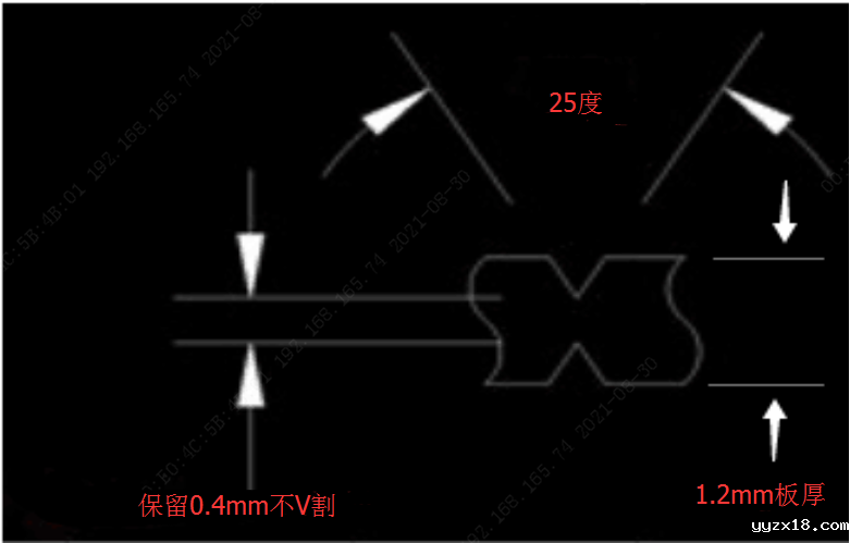 yyzx18V割一律采用1/3余厚,一面V-CUT掉1/3,即V板厚的2/3,留1/3,33.3%(+/-0.1mm),V割角度:25度
