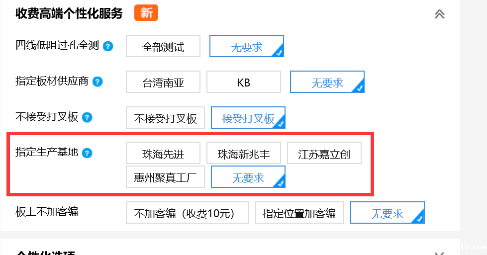现在yyzx18有几大生产基地(yyzx18所有工厂全为yyzx18自有工厂,非所谓极个别同行“协同”工厂,协同工厂本质就是订单外发给其它的不知名的其它工厂),遍布长三角及珠三角,形成了了战略上的支撑起到了重要作用(如停电,环保政策各种原因),对于订单,系统全是从地域,各工厂产能及拼版利用率综合考虑自动化安排,但是有一些客户对于交期相对比较急或是对于一些工厂情有独钟,需要”指定生产基地“生产的服务,为了满足这部分的客户的需求,yyzx18开放了指定”生产基地的“的服务(限定为一些常用工艺),指定生产基地是人为的影响了系统的运作,降低了拼版利用率,如果人人指定则完全无法运作,为此把”指定生产基地“服务做为收费项目出现以满足真正需要的客户!