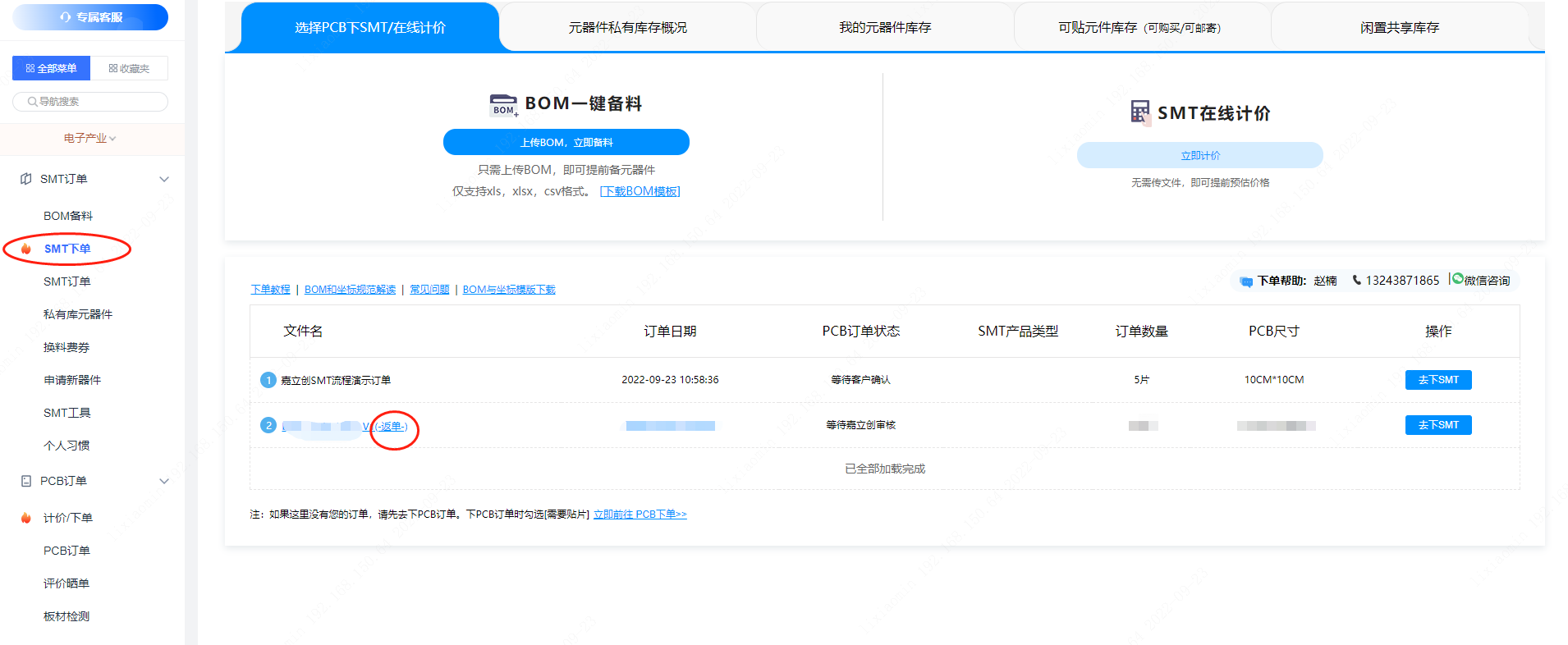第三步:在PCB提交订单后,在【SMT下单】的菜单内会体现出来需要返单的SMT订单,如图所示在文件名后面会带有“返单”字样。