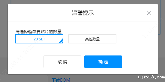 1.对于PCB数量在100和100片以上,系统会弹出“”返单要贴片的数量的页面,您根据需要选好数量。