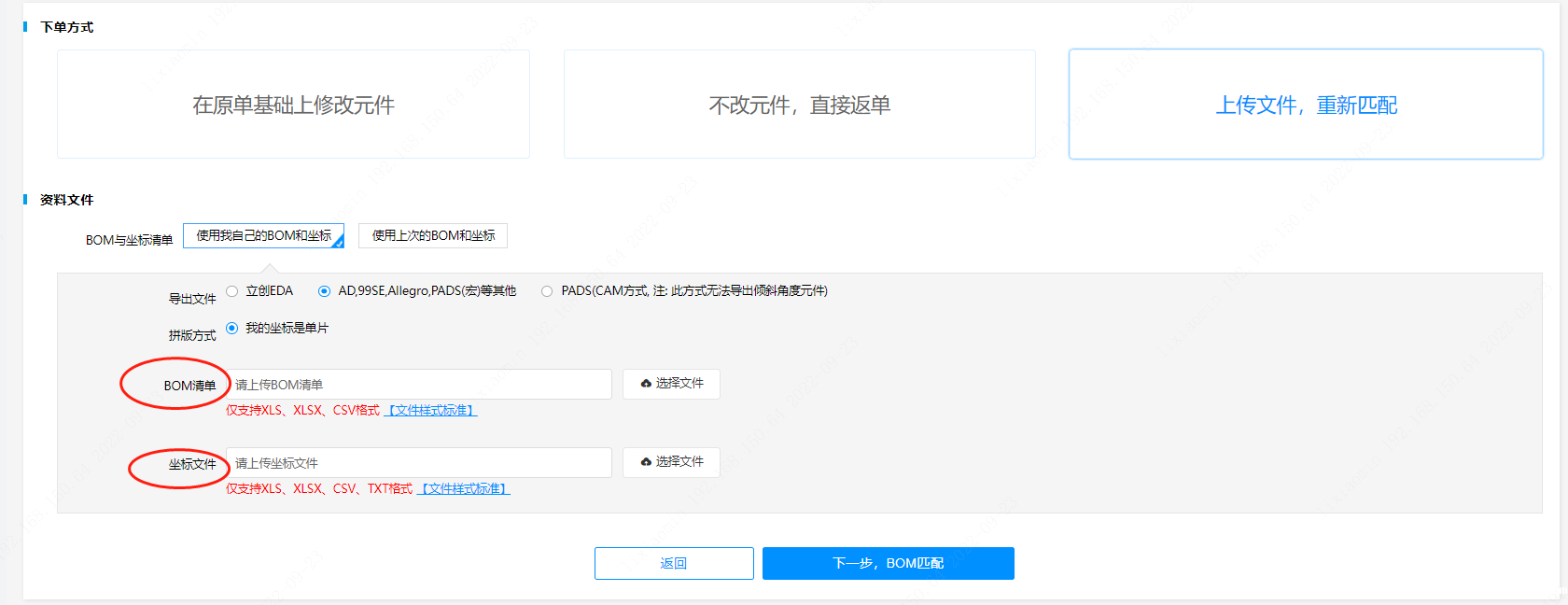 第四步:而后点击【去下SMT】按钮后会出现“下单方式”、“资料文件”页面框,您可以选择您需要的【下单方式】(“在原单基础上修改元件”/“不改元件,直接返单”/“上传文件,重新匹配”)后点击下一步。
