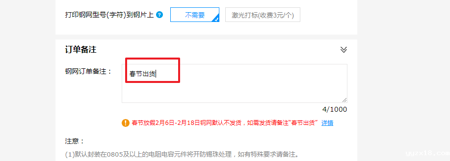 如钢网需要春节出货,请在备注中填写, 春节出货 4个字, 默认不填的情况下,钢网将不会出货。