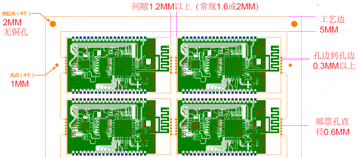 邮票孔拼板可以称为"万能拼板",只要有位置添加邮票孔的,各类形状的板均可以通过邮票孔相连。邮票孔连接位的数量、连接位的大小,整个SET的连接是否稳定,与PCB板在贴片的质量有直接联系 。