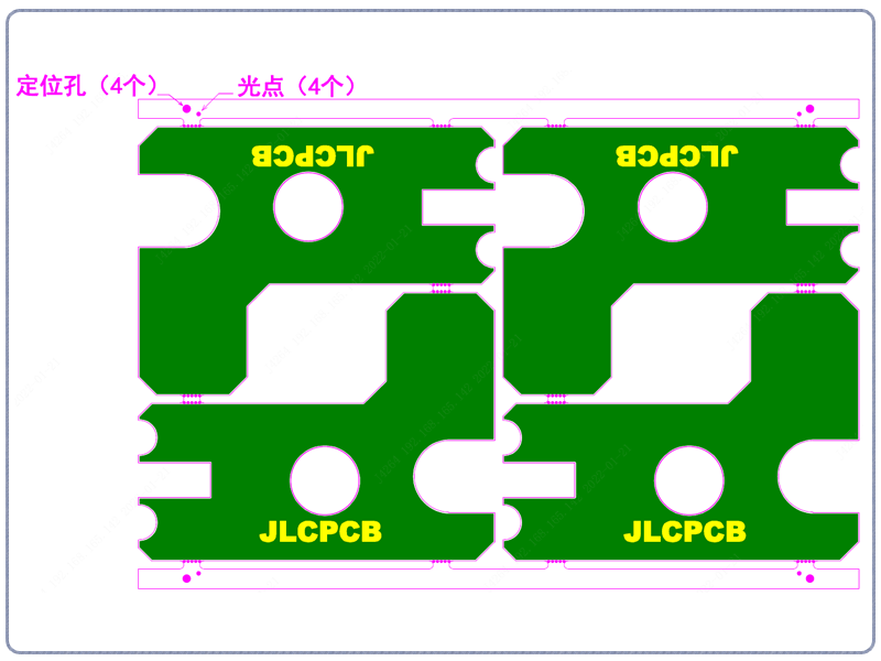 ③ 客户提供拼板图没有gerber的,只参考样式拼板,不规范的位置我们自行调整(如邮票孔,连接位,间隙等),定位孔和Mark点也可以自行调整,不按图纸对应来添加。