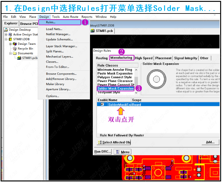 1. 打开文件,在菜单项中选择Design-Rules,然后在新打开的菜单中选择"SolerMaskExpansion..."双击点开