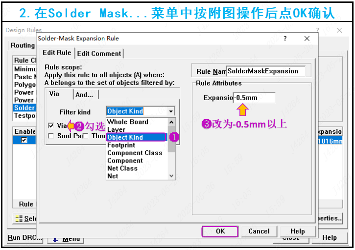 2. 在Solder-Mask Expansion Rule菜单中按图示操作处理,就完成了所有过孔盖油的操作了