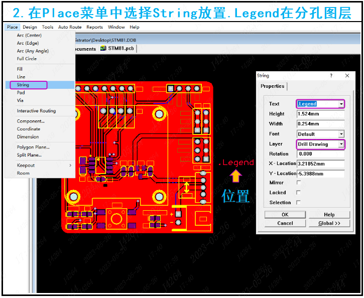 二、放置分孔图表:在Place菜单中选择String放置“.Legend”(快捷键P-S)在DrillDrawing(分孔图层),位置在板子右边或上方。