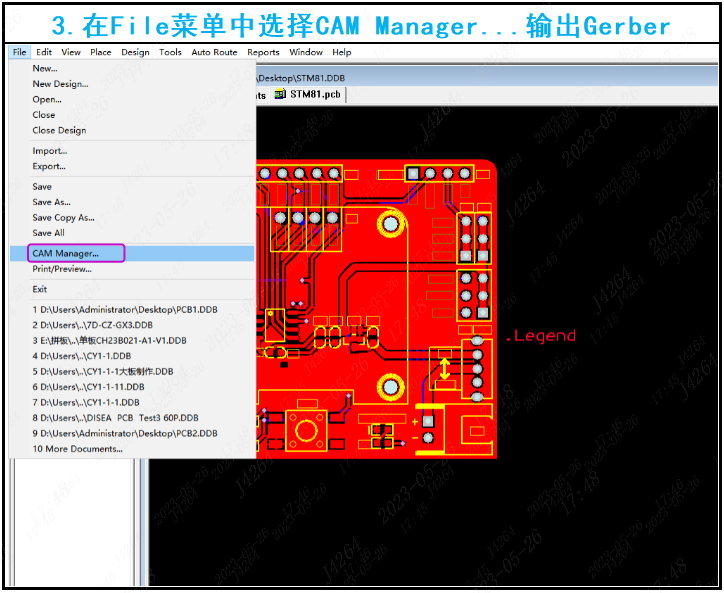 三、输出Gerber:在File菜单中选择CAM Manager...输出Gerber