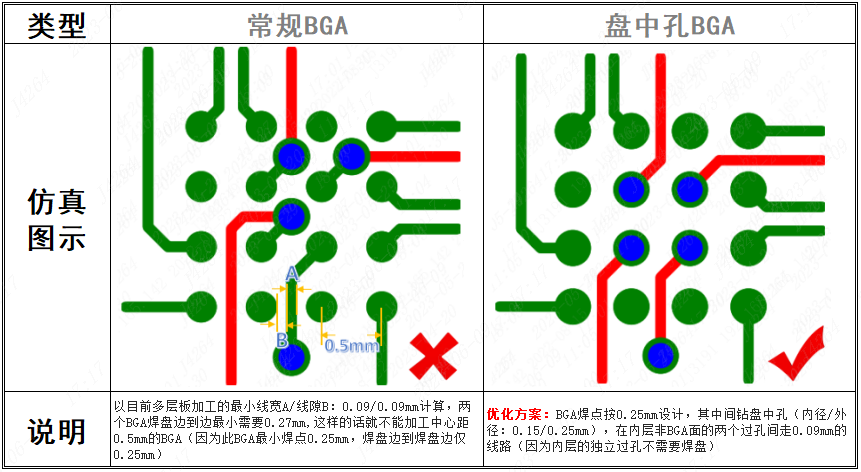 1)BGA焊盘到线路距离近,且BGA焊盘需要开窗,那么就需要有一定的安全间距,传统生产中达不到此间距的只能削掉BGA焊盘