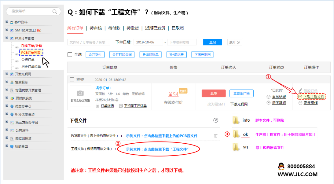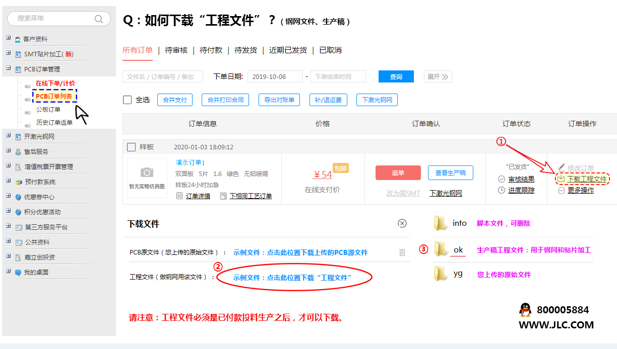 您好,在PCB订单列表中 ,点文件名 ,选择工程文件(做钢网用该文件)即可下载。如下图示