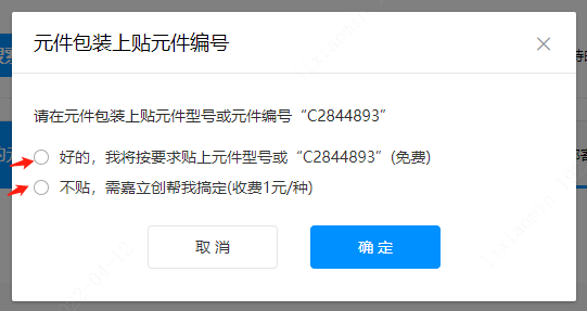 (1)点【请选择是否已贴编号】会出现选择弹窗,在元件包装上勾选由客户自己贴或 贴元件编号,并补充元器件的基本封装信息。