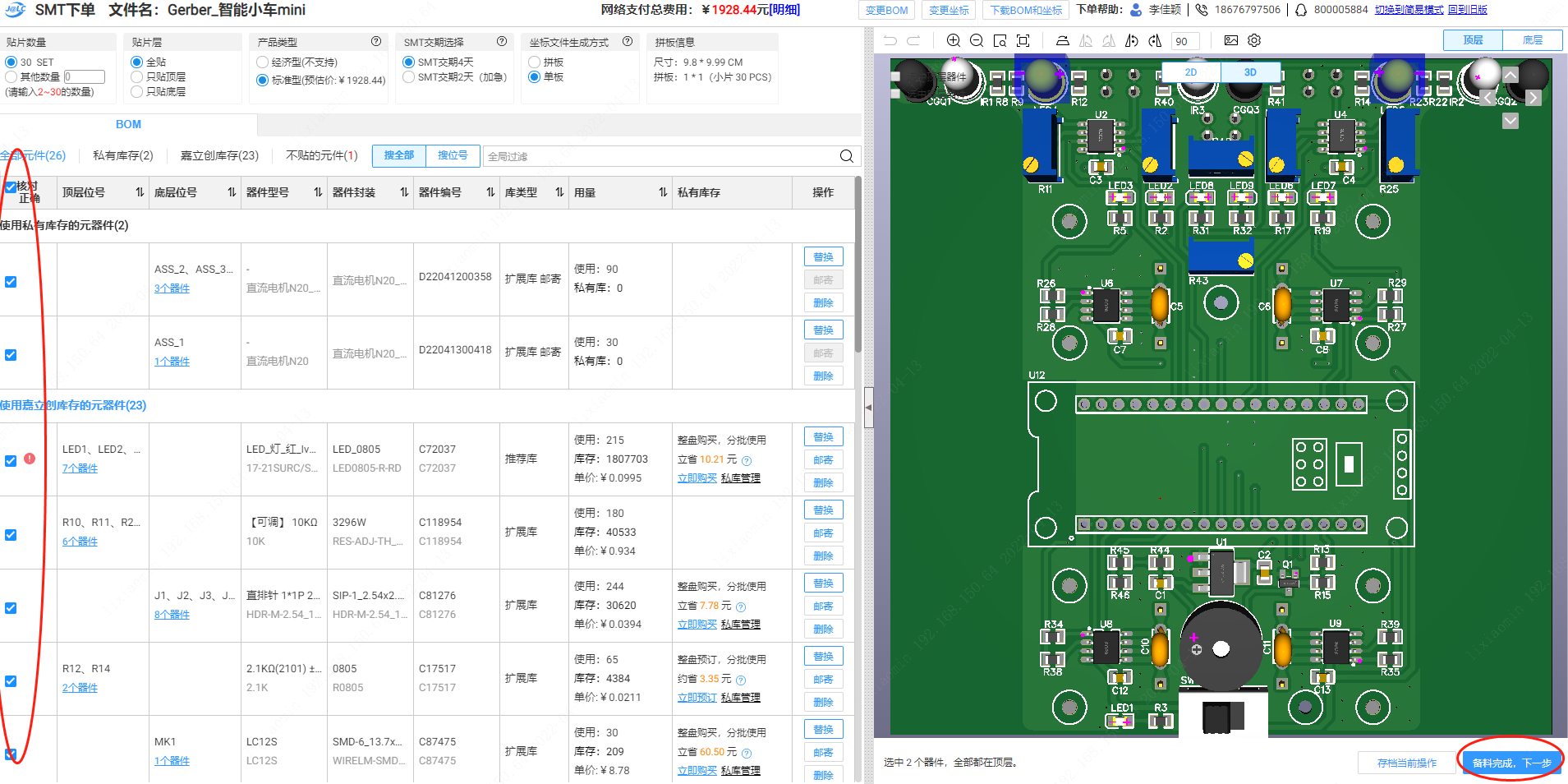 第四步:确定好需要邮寄的器件型号,勾选【核对正确】,要确保所有都勾上,匹配完成后,然后点【备料完成,下一步】