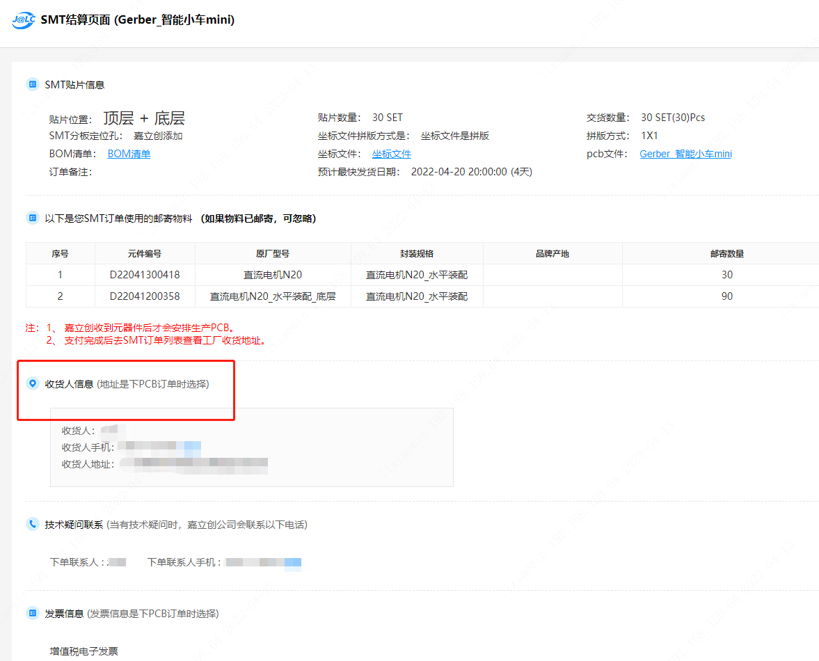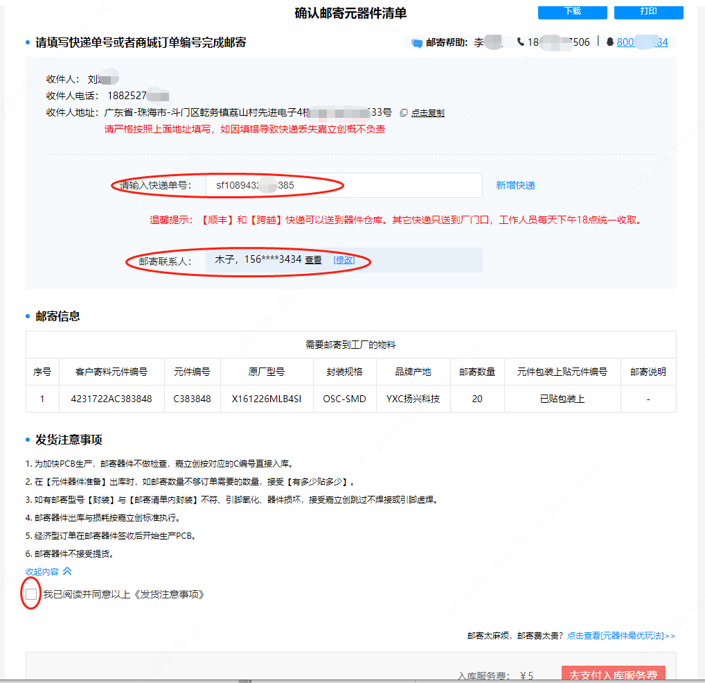 第十步:点完后会弹出确认邮寄元器件清单页面,这个页面需要您下好快递(记得在每个需要邮寄的器件包装袋上写好器件编号),下好后回来填好【快递单号】、【邮寄联系人】,阅读并勾选发货注意事项。