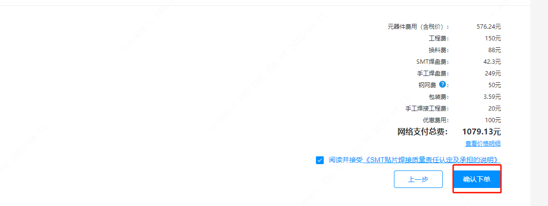 第七步:核对好后,点【确认下单】,点完后系统会自动跳回主页,这样需要邮寄的器件才算真正加入到【待邮寄】清单里,未下单的话,需要邮寄的器件不会显示出来。(若您属于标准型号的订单,将不再等邮寄器件入库。PCB资料与SMT工程资料做好后,即可安排生产。)
