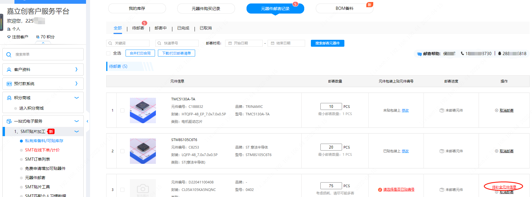 若您在邮寄元器件后,想要查询器件是否入库、变更/增加快递号,邮寄库存查询、邮寄器件库存清单、邮寄合同等信息。