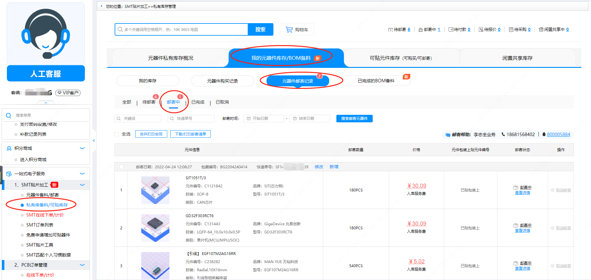 在【私有库备料/可贴库存】的菜单中,点“我有元器件库存/BOM备料”字样,再点击【元件邮寄记录】,可以看到邮寄的各种状态。在【邮寄中】的状态可以“修改”或者“新增”快递号信息。