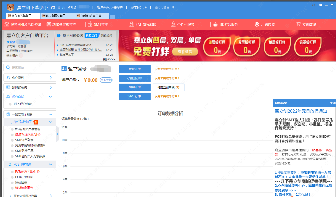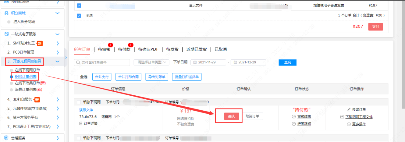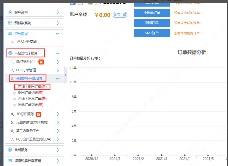 登录系统后,在系统左侧的菜单栏,找到“开激光钢网”目录,下面的“在线下钢网订单”。