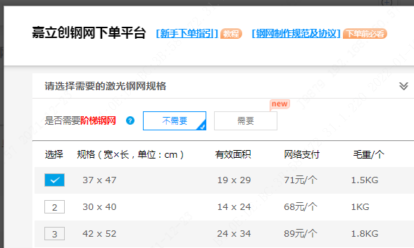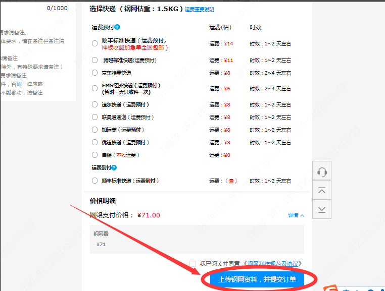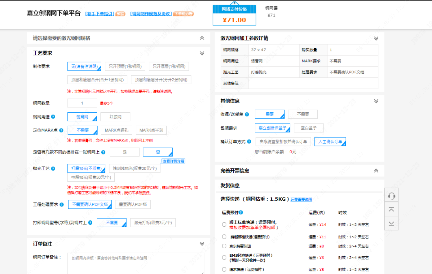 2、下单页面从上到下,从左到右依次填写钢网工艺要求及收货信息,选择好快递、收据和发票等信息。