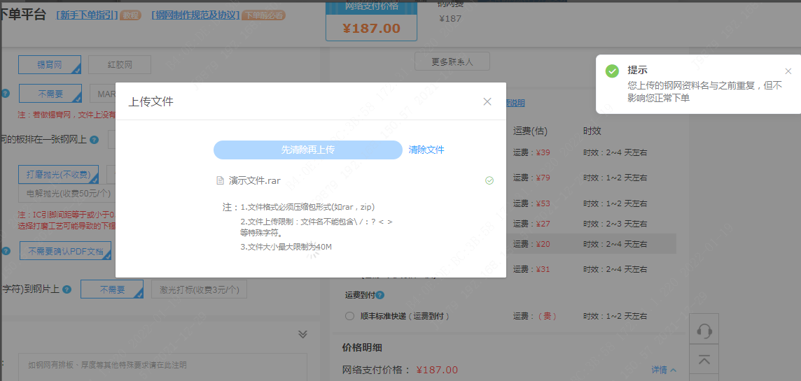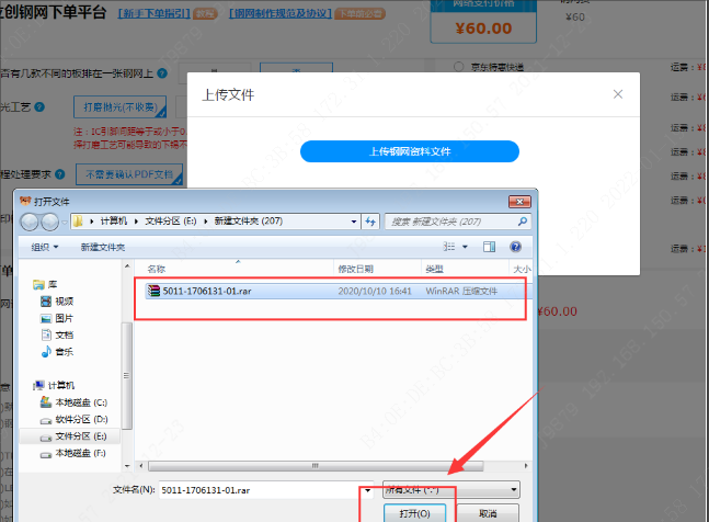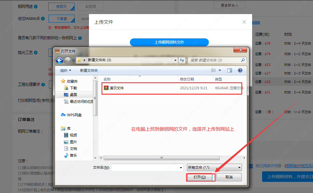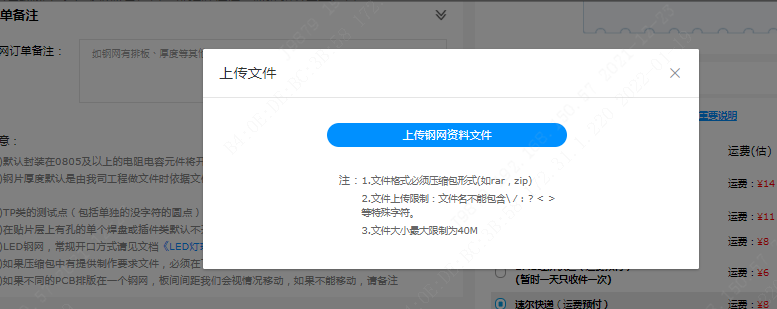选好工艺及收货信息后,接下来就是上传钢网文件。点击右下角的提交订单,在弹出的窗口选择需上传的文件。 注意:钢网文件需打包成压缩包形式。如rar,zip。