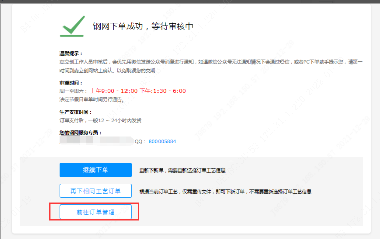上传文件成功后,下单结束,返回订单管理,等待 工作人员审核订单。