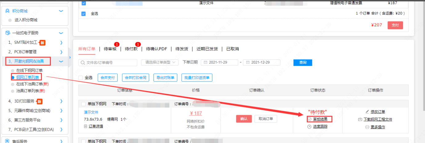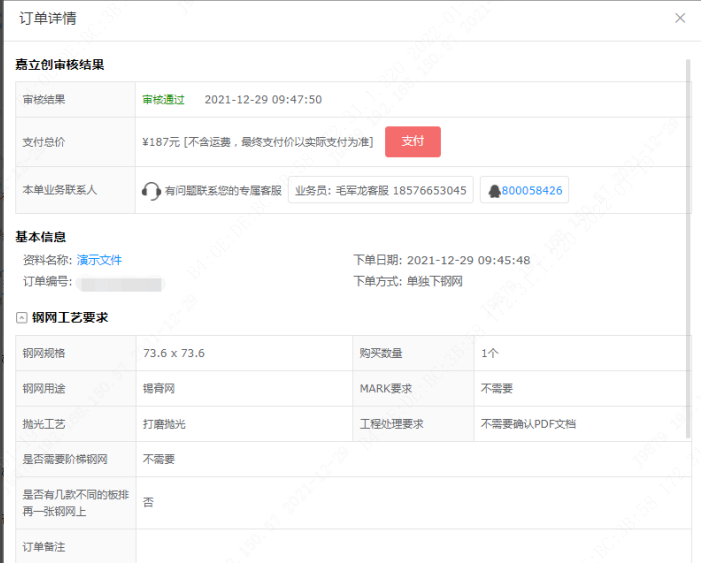 1. 市场人员审核好订单之后,这个订单状态就会显示:待付款。 请先点开审核结果确认工艺与价格是否有误。