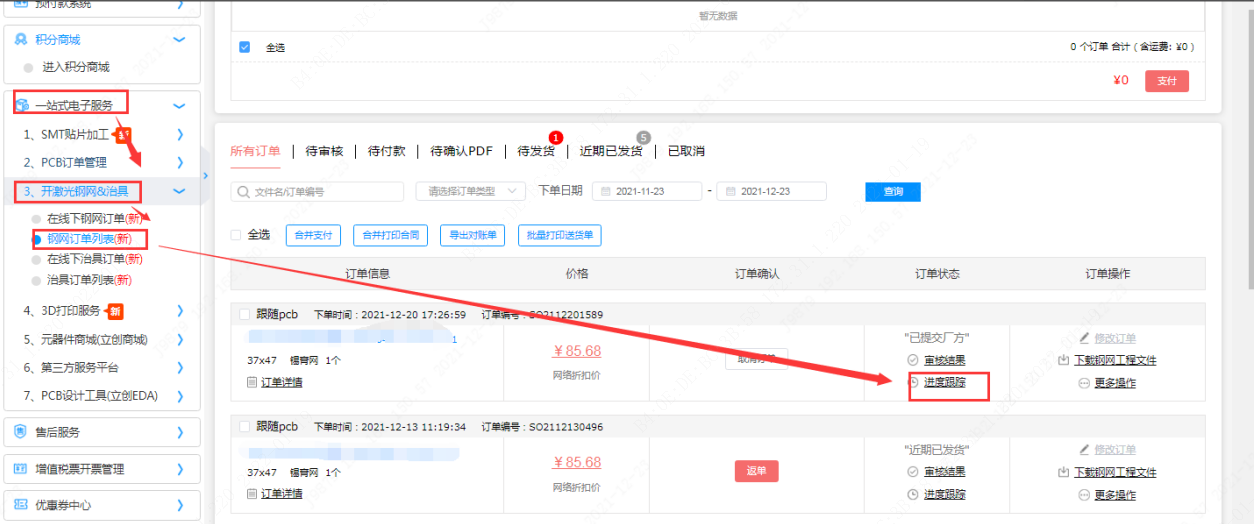 单击进度跟踪后自动弹出下面对话框:查看整个钢网的生产进度,包括下面几个环节:提取资料->完成资料-》切割钢网-》QC检测-》发货