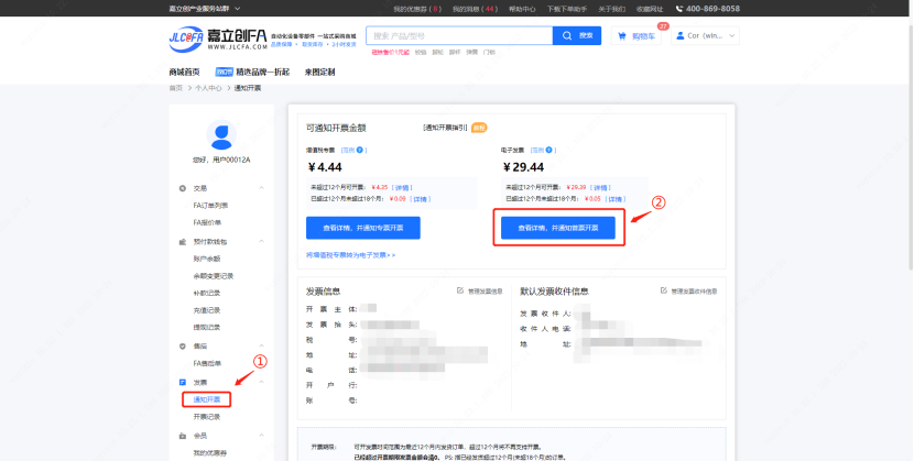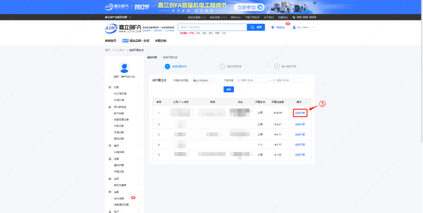 客户在FA商城个人中心->发票管理->通知开票生成开票记录->后台审核&开票。