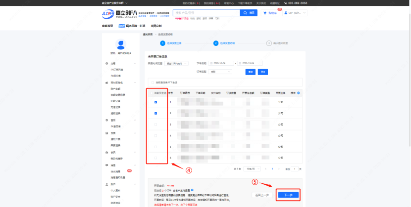 ④ 勾选一个/多个需要开票的订单,点击下一步。