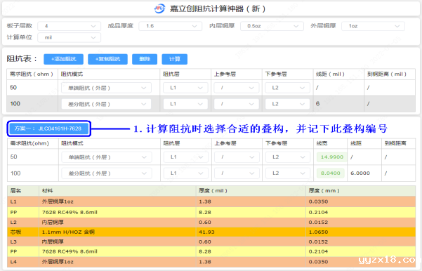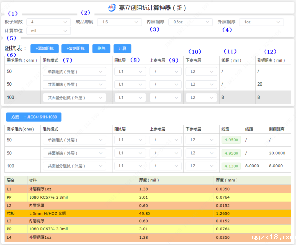 (16)计算:上面1-12项输入或选择后,点“计算”可计算出线宽及叠构信息