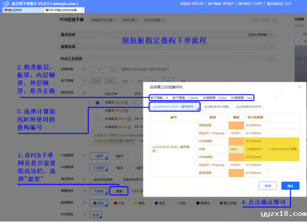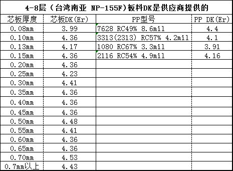 (5)以上计算结果,4-8层默认使用的南亚 NP-155F材料,8层以上使用的是生益S1000-2M材料,因此在下单时,尽量按要求选择指定板料,保证阻抗一致性。