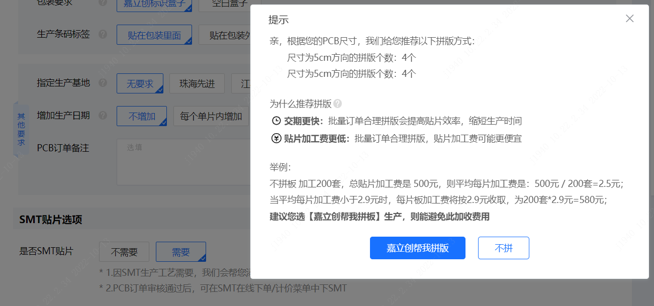 2、当选择需要SMT时,系统也会给您推荐拼版
