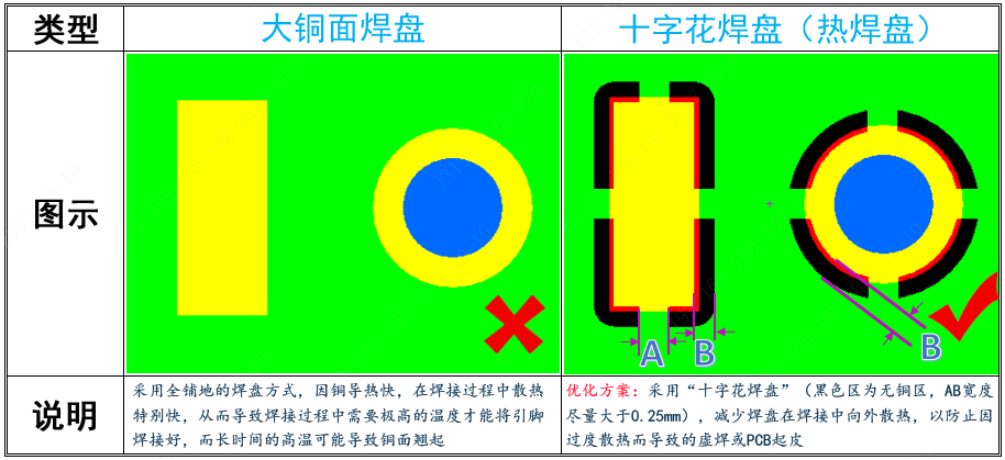 我们知道铜的导热率很高(导热率大概380W),因此不管是手工焊接还是回流焊,在焊接时铜面都会迅速导热,而致使烙铁等温度流失,对焊接产生影响,因此设计上尽量采用"十字花焊盘"减少热量散发,方便焊接。