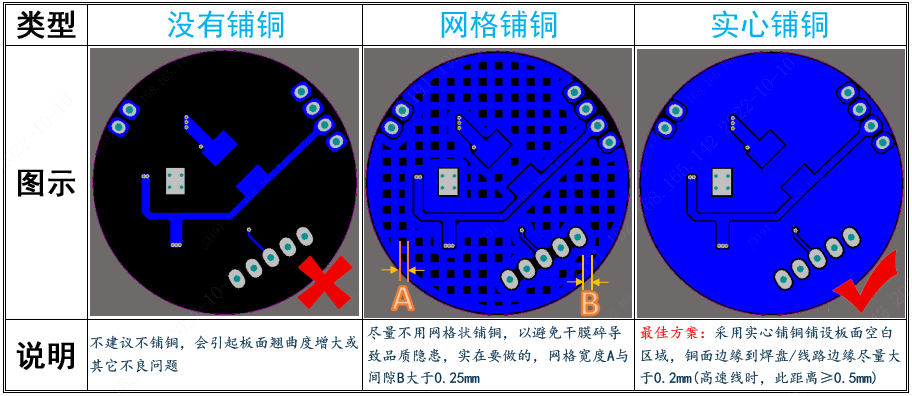 设计建议:板内空旷区尽量覆上铜皮,如有高速信号线,离信号线需有0.5mm以上的距离