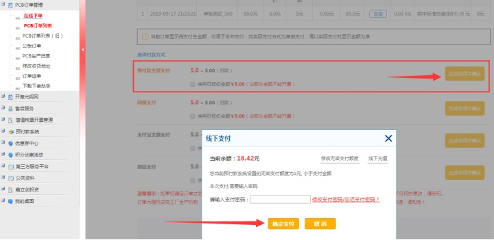 注意:预付款账户有余额,可以选择使用预付款现金账户支付,支付密码或者手机动态密码支付都可以支付成功,假如余额不足,正常输入密码,系统会提示余额不足,可以选择其他支付方式。