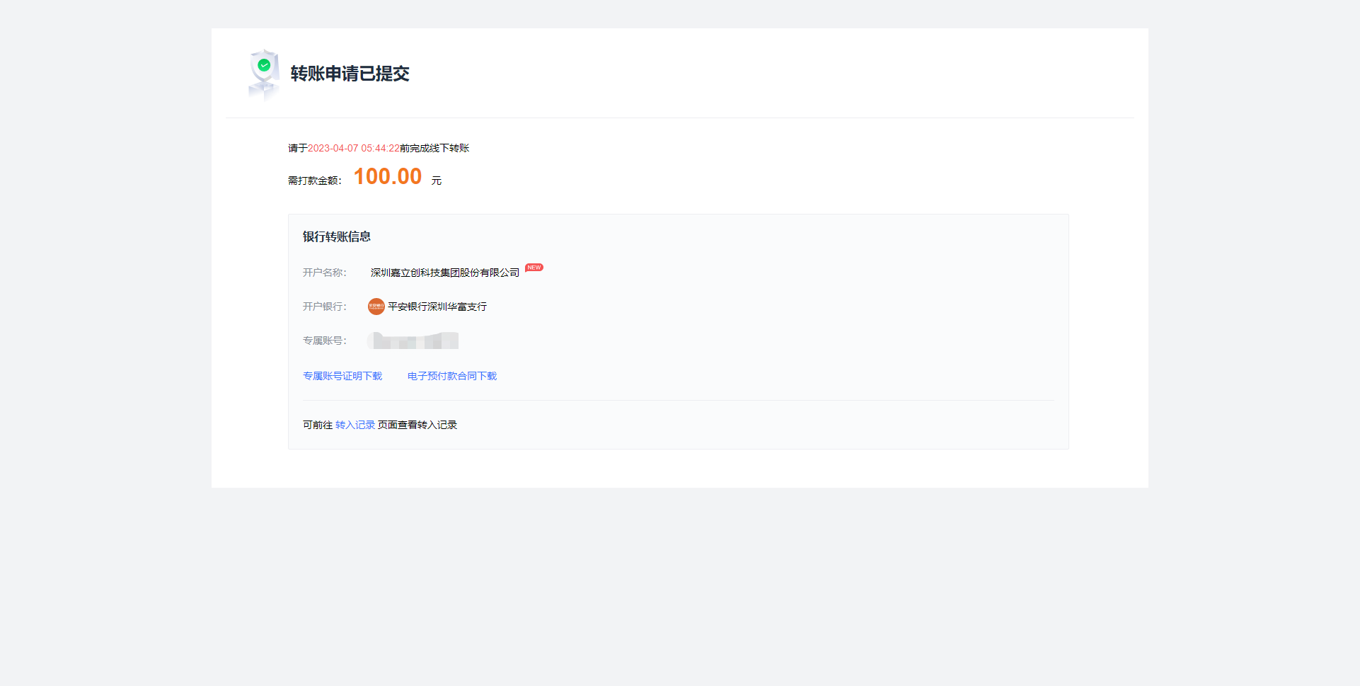 (2)充值金额无限制,请务必在打款到我司前,先在系统上提交银行转款信息,按照系统提示的实际打款金额及专属账号打款,否则无法系统自动入帐充值。
