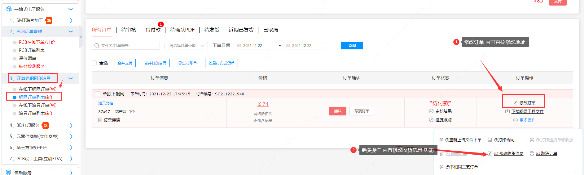 1)请在【 钢网订单列表----》修改收货地址】进行修改。所下图所示: