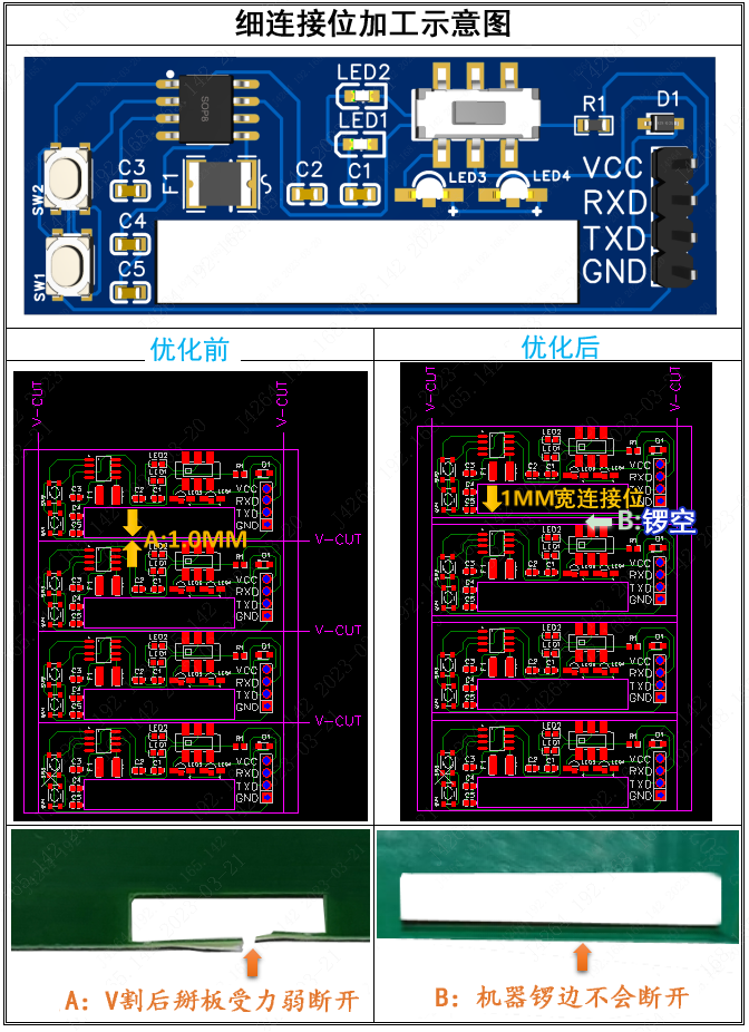 在实际的生产中,有时会遇到细窄狭长的连接位,有的上面可能会布线,在PCB加工V割后,客户在分板时由于受力不均,细窄的地方受力弱,掰板时容易断开(如下图A处)。此时我们可以更改一下拼板方式,把板与板中间拉开1.6-2MM的间隙,从而让这些细窄狭长的连接位采用锣边方式锣出来(如下图B处),这样就不用再掰开这个地方,从而避免断板了。