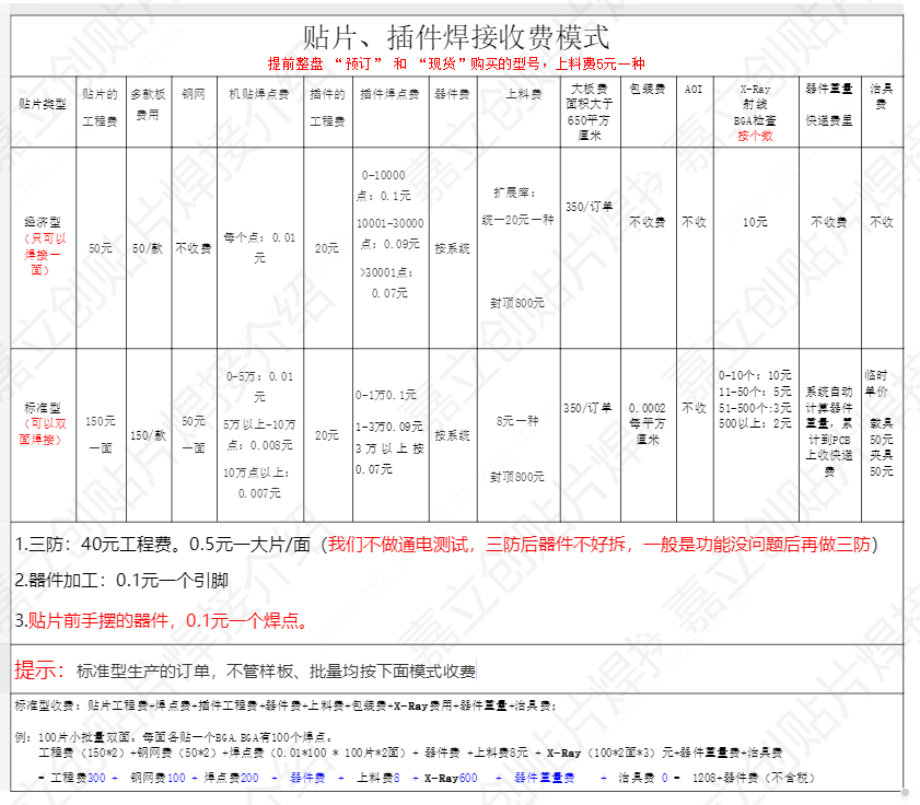 标准型收费:贴片工程费+焊点费+插件工程费+器件费+上料费+包装费+X-Ray费用+器件重量+治具费;