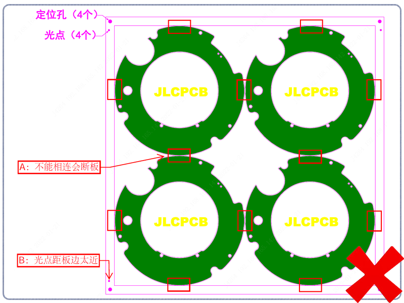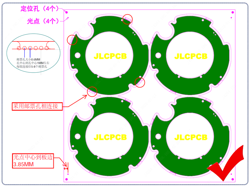 修正点:板与板间采用邮票孔拼板(邮票孔会出现齿状毛刺),同时调整好光点位置。