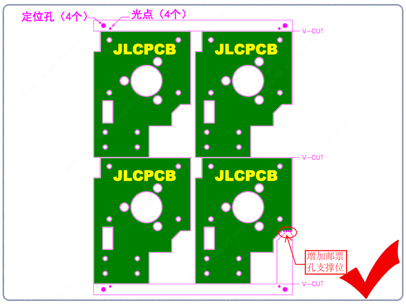 2)能V割拼板,尽量改为V割拼,毕竟邮票孔会产生齿状毛刺;