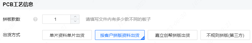 常规的矩形板,采用V割方式的且同一面同方向拼板的小批量板,可以下单时选择由 工程免费拼板: