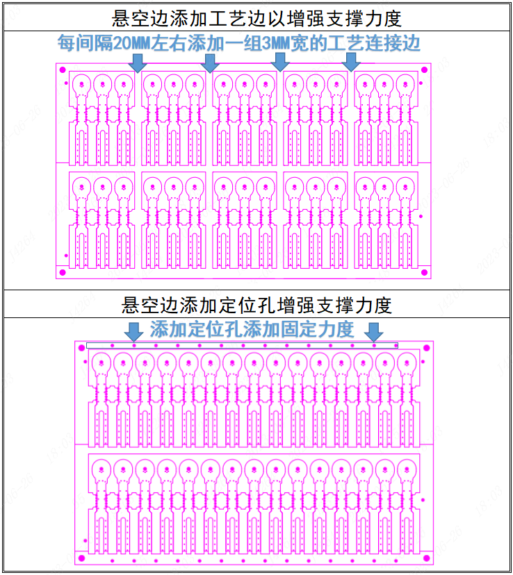 我司锣边分为精锣(公差+/-0.1MM)与粗锣(公差+/-0.2MM)两种加工方式,精锣是采用两次锣边方式来加工的,为了保证精锣定位,每个精锣单元至少需要2个以上的定位孔,在实际加工中,在锣完第一次后,因悬空边过长,第二次锣边时抖动会导致锣变形