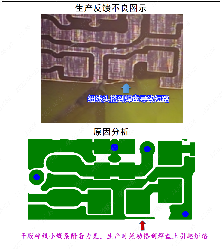 为了提供高品质的产品,我司采用正片+干膜制作工艺(点此查看正片工艺详细说明),可以加工更精密的线路并提供优良的产品。行业中干膜工艺存在一种干膜碎,简单的说就是很细小的线条,因附着力弱,易晃动搭到周边的线路或焊盘上面,从而出现开短路的不良情况。此细小线条大多数为软件铺铜或是CAM削铜后残留的无用线条,因此设计上需要删除或优化处理。