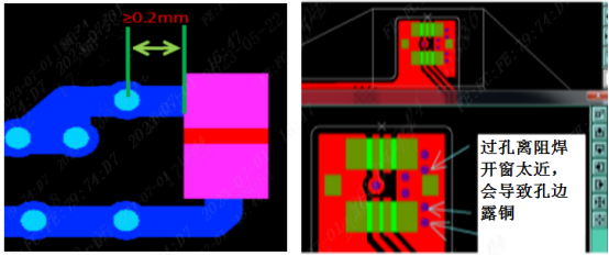(2)过孔离防焊开窗保证0.2mm以上,否则会导致孔边露铜